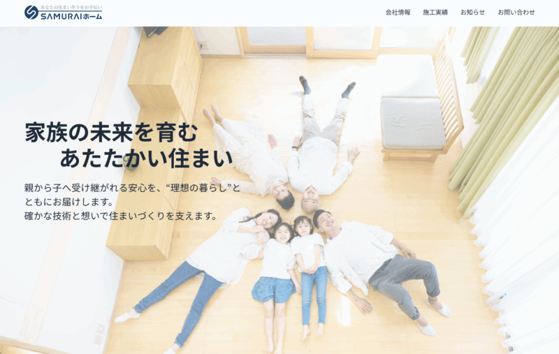 全体のトーンは、明るくナチュラルな雰囲気で統一。ファーストビューには、家族が自然体でくつろぐ写真を大きく配置し、信頼感と安心感を第一印象で伝える構成にしています。